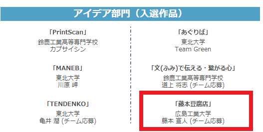 昨年末から広島工業大学の先生、学生さん達と挑戦したDigital Youth Awardというコンテストで、その中のチーム藤本が見事入選しました!!
